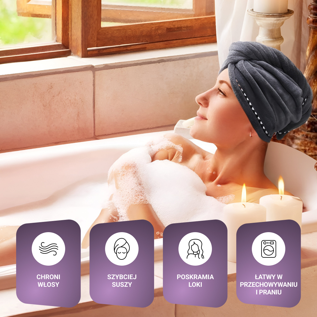 Mikrofibra o wysokiej chłonności szybko usuwa nadmiar wody, skracając czas suszenia i utrzymując włosy w zdrowiu.