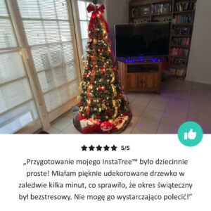 Idealnie nadaje się do mieszkania. Jest łatwa w montażu i przechowywaniu. Jeśli masz napięty grafik pracy, tak jak ja, jest to idealne rozwiązanie do szybkiego ustawienia choinki z już umieszczonymi dekoracjami. Można ją również szybko schować. Gorąco polecam.